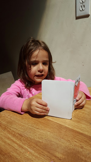 Sonia loves the books that come in our Mother Goose Time curriculum because she loves to pretend she is an author. What I didn't know was that she was able to recognize words! From our book, I learned that Sonia can recognize "cat", "love" and a few other words. How amazing! Daniella loves to color and tape the book together. You will often find the girls in their comfy library, reading their books to each other.